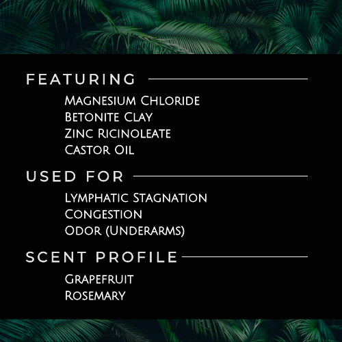 This potent Detox Balm is expertly formulated to support the body's natural cleansing process. Combining transdermal Magnesium and purifying Bentonite Clay with circulation-boosting essential oils like Cypress and Rosemary for deep detoxification, this balm is a powerful aid in relieving stagnation and stimulating flow. Grapefruit provides a purifying lift, while Zinc Ricinoleate works naturally to neutralize odors. Massage this luxurious balm into underarms or lymph points to nourish, cleanse, and gently encourage lymphatic movement.
