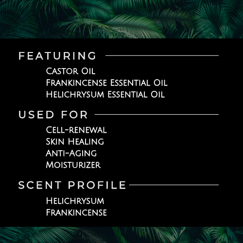 Ricinus communis (Castor) Seed Oil, Boswellia Frereana (Frankincense) Oil, Helichrysum Italicum Flower Essential Oil, Tocopherol (Vitamin E).