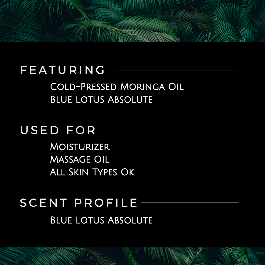 Nymphaea Caerulea (Blue Lotus) Infused Moringa Oleifera Seed Oil, Nymphaea Caerulea (Blue Lotus) Absolute, Tocopherol (Vitamin E).